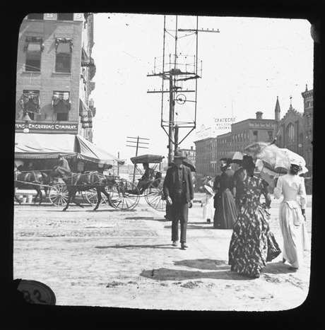 Women with parasols walk down Woodward Ave. in the right foreground and a man in a suit and hat approaches them, an electrical transformer stands in the middle of the image with men in a horse-drawn vehicles in left background, businesses in background of either side of street. Recorded in lantern slide ledger: "D/Streets-Woodward."