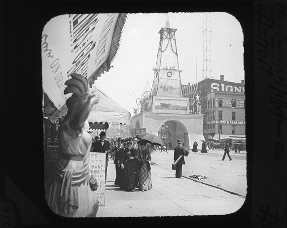 Men and women walk down the sidewalk past a GAR triumphal arch on Woodward Avenue, a photographer stands, holding his equipment in center of image, a wooden Indian stands under a restaurant sign in the left foreground and businesses can be seen in the right background. Recorded in lantern slide ledger: "D/Streets-Woodward at Jefferson."