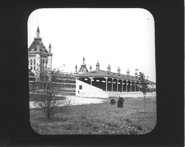View of buildings erected for the Detroit International Fair and Exposition on the Detroit River south of Fort Wayne. Recorded in lantern slide ledger: "D/Exhibitions-Detroit International Fair & Exposition, c.1889."