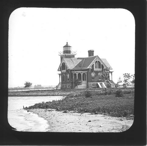 View of the lighthouse on Belle Isle with Victorian residence either attached to lighthouse or right next to it and a view of the shoreline. Recorded in lantern slide ledger: "D/Parks-Belle Isle, lighthouse."