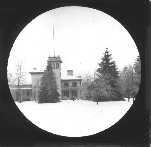 View of the Daniel Scotten residence on Vinewood near Fort St. in winter, with trees in foreground. Lantern slide mount has a round opening. Recorded in lantern slide ledger: B/Scotton, Daniel residence."