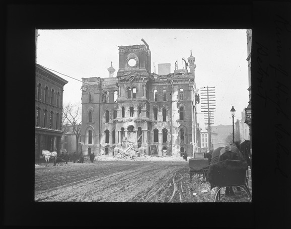 Favorite this☆ Capitol Union High School in ruins Description: View of the burned ruins of the high school from the front showing the street with several people and horse-drawn sleds. Recorded in lantern slide ledger: "D/Schools-high school ruins, burned Jan. 27, 1893, horse drawn sleds." Details Resource ID: EB02c473 Subject: High school buildings--Michigan--Detroit High school buildings--Fires and fire prevention Lantern slides Date Issued: 1893 Format: 1 transparency : glass ; 3.25 x 4 in. Member of: Burton Historical Collection Negative Number: BHC lantern slide no. 314; BHC glass neg. no. 1277 Rights: Physical rights are retained by DPL. Copyright is retained in accordance with U.S. copyright laws.