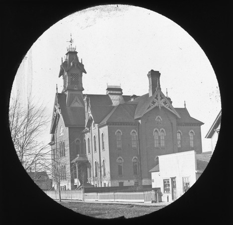 View of the Webster School, located on 21st St. between Howard and Marquette Streets, built in 1874. A small wooden structure is visible in the foreground. The lantern slide mount has a round opening. Recorded in lantern slide ledger: "D/Schools-Webster."