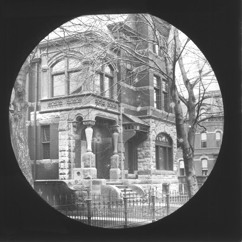 View of an unidentified residence. The image shows a portion of the facade with elaborate trimmed porch and windows, a highly ornate fence can be seen in the foreground. The lantern slide mount has a round opening. Some damage to the emulsion is apparent. Recorded in lantern slide ledger: "D/Railroads-Michigan Central Station, W. Jefferson and Third."