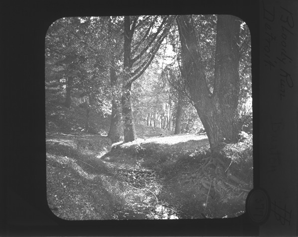 View of Parent's Creek, a small tributary of the Detroit River, which became known as Bloody Run after the Battle of Bloody Run. Near this site, in late July 1763, the British and Indians fought the fiercest battle of Chief Pontiac's uprising. The image shows the creek with a few large trees on the banks. The slide is titled "Bloody Run Detroit." Recorded in lantern slide ledger: "D/Bloody Run."