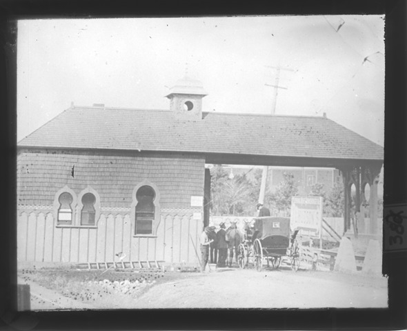 Horse-drawn carriage stopped at an unidentified tollhouse, the driver and a few other men are visible. The building is wooden with unusually shaped windows and a small cupola, the upper portion is covered with shingles. Recorded in lantern slide ledger: "D/Tollgate."