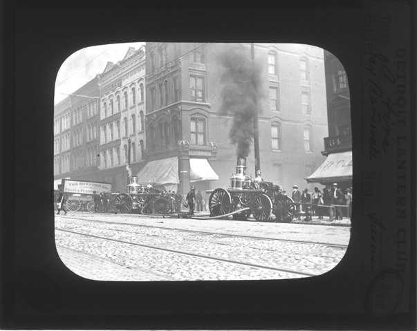 Two fire engines are at the corner of Jefferson and Cass. Smoke but no flames are visible, groups of people are on the sidewalk and in the street.The Dwyer and Vhay fruit sellers building is on one corner and saddlery is also visible. Detroit Lantern Club mount. Handwritten on front: "A fire." Recorded in lantern slide ledger: "D/Fire Department-Fire."