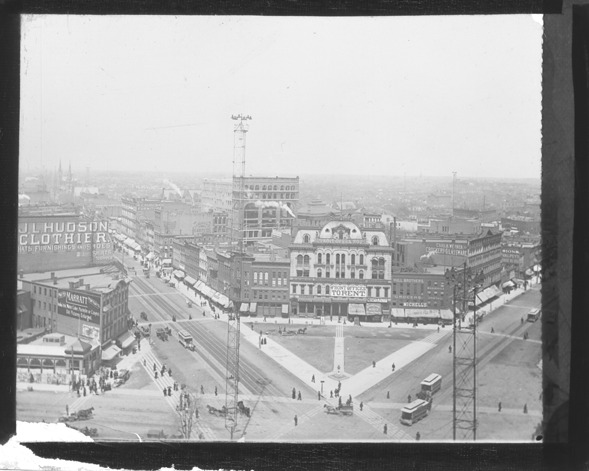 Bird's-eye view of the city of Detroit at Campus Martius. The Detroit Opera House and J.L. Hudson's Clothier are visible along with other businesses. There are horse-drawn trolleys as well as wagons and foot traffic. Recorded in lantern slide ledger: "D/Streets-Campus Martius, Opera House offices, 1881."