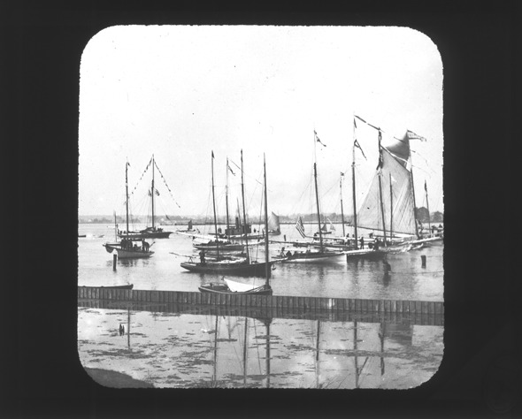 Sailboats moored on the Detroit River; a few have their sails raised. Recorded in lantern slide ledger: "D/River-sail boats along dock."