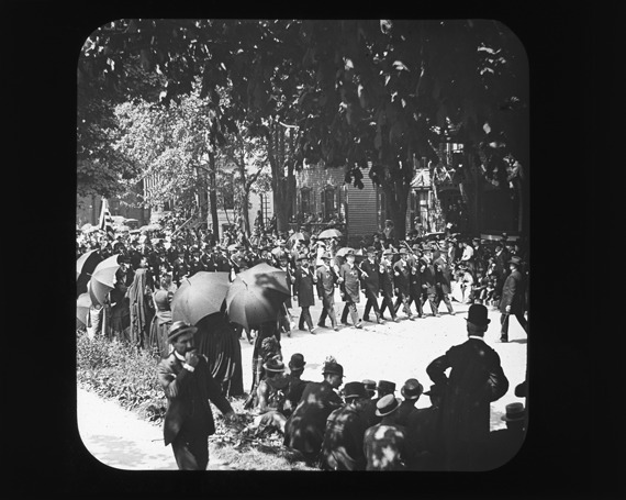 Crowd of spectators watch G.A.R. members marching in formation at G.A.R. parade, with houses in background. Recorded in lantern slide ledger: "D/Parades-G.A.R., Detroit Post G.A.R."