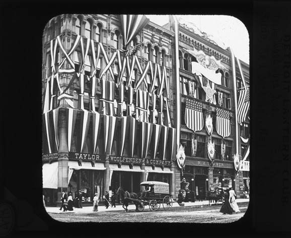 View of Taylor, Woolfenden & Co. and R.H. Traver Co., both decorated with flags and bunting on Woodward Avenue in Detroit, Michigan. Pedestrians and a horse-drawn vehicle can be seen in foreground. Recorded in lantern slide ledger: "D/Industries & business houses-Taylor, Woolfenden & Co."