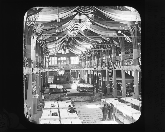 Favorite this☆ Main hall at Camp Sherman Description: View of a large open building with two rows of cots arranged down the center and bunting hanging from the ceiling, erected for a G.A.R. reunion. Lantern slide ledger reads, "D/Expositions-G.A.R., Camp Sherman, main hall." Details Resource ID: EB02c624 Creator: Bardwell, Jex, 1824-1902 Subject: Grand Army of the Republic. National Encampment Exhibition buildings--Michigan--Detroit Beds--Michigan--Detroit Photographers--Michigan--Detroit Lantern slides Date Issued: 1891 Format: 1 transparency : glass ; 3 x 4 in. Member of: Burton Historical Collection Negative Number: BHC lantern slide no. 502 Rights: Physical rights are retained by DPL. Copyright is retained in accordance with U.S. copyright laws.