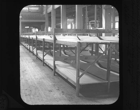 Favorite this☆ Sleeping cots at Camp Sherman Description: A view of a line of cots with numbers on them at Camp Sherman, erected for a G.A.R. reunion. Recorded in lantern slide ledger: "D/Conventions-G.A.R., showing sleeping arrangements." Details Resource ID: EB02c626 Subject: Grand Army of the Republic. National Encampment Exhibition buildings--Michigan--Detroit Exhibitions--Michigan--Detroit Beds--Michigan--Detroit Lantern slides Date Issued: 1891 Format: 1 transparency : glass ; 3 x 4 in. Member of: Burton Historical Collection Negative Number: BHC lantern slide no. 504 Rights: Physical rights are retained by DPL. Copyright is retained in accordance with U.S. copyright laws.