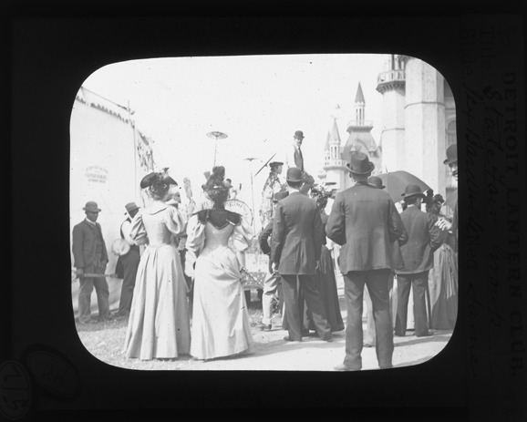 View of crowd watching a performance at the Michigan State Fair in Detroit, two musicians holding banjos stand in left background. Recorded in lantern slide ledger: "M/State Fair, display booths."
