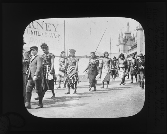 View of people described by lantern slide ledger as, "South Sea Islanders," marching in a parade at the Michigan State Fair.