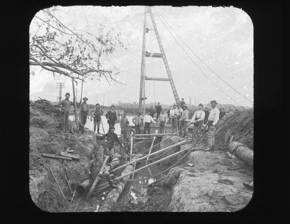Group of workers posing in and around a ditch into which a main gas line is being laid. A tall piece of equipment stands in background. Written in lantern slide ledger, "Laying gas main from Ohio to Detroit." Slide is cracked in upper left.