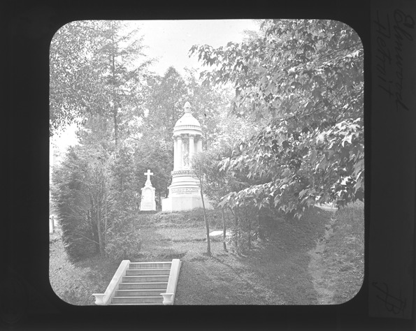 Concrete stairs lead up to a cupola grave monument, which is surrounded by trees and brush, at Elmwood Cemetery in Detroit, Michigan. Recorded in lantern slide ledger: "D/Cemeteries-Elmwod, cupola monument and stairway."