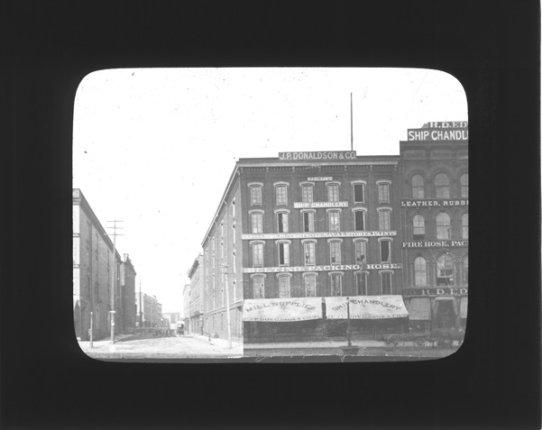 Favorite this☆ J.P. Donaldson & Co. on Woodward Avenue Description: J.P. Donaldson & Co. on Woodward Avenue near Atwater, with a view down the street at left. Recorded in lantern slide ledger: "D/Streets-Woodward, at Atwater St., J.P. Donaldson Co." Details Resource ID: EB02c692 Subject: Commercial buildings--Michigan--Detroit Ship chandlers--Michigan--Detroit Streets--Michigan--Detroit Lantern slides Date Issued: Unknown year Format: 1 transparency : glass ; 3.25 x 4 in. Member of: Burton Historical Collection Negative Number: BHC lantern slide no. 589 Rights: Physical rights are retained by DPL. Copyright is retained in accordance with U.S. copyright laws.