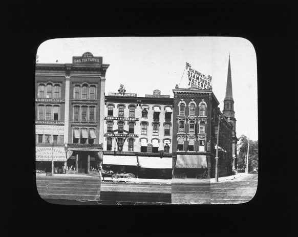 View of F. Rolshoven & Co., and other businesses on Woodward Avenue at State Street. Recorded in lantern slide ledger: "D/Industries & business houses-Rolshoven & Co., Jewelers."