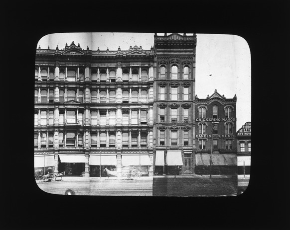 Detroit Music Company and other businesses on Woodward Avenue, with a view of the street. Recorded in lantern slide ledger: "D/Industries & business houses-Detroit Music Co."