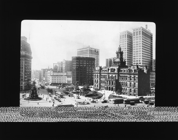 Bird's-eye view of the city of Detroit at Campus Martius, with the Soldiers' and Sailors' monument at the left, and buildings, including the Detroit City Hall, in the background, with foot traffic, automobiles and streetcars on the street. Lantern slide ledger reads, "D/Streets- Campus Martius, City Hall, Soldiers' and Sailors' monument, Detroit Publishing Co."