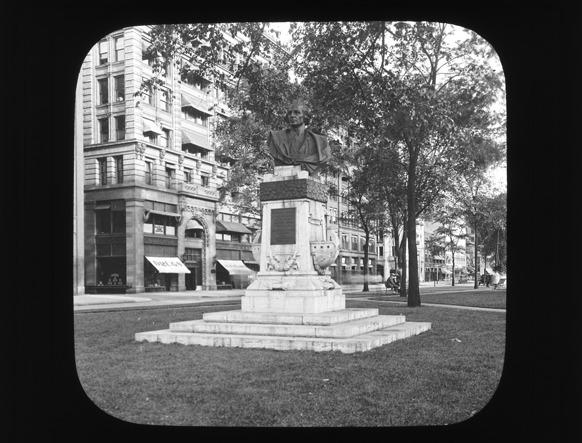 Bronze and travertine bust of Christopher Columbus designed by Augusto Rivalta and installed at the north end of Grand Circus Park, at Washington Boulevard in 1910; businesses in background. Recorded in lantern slide ledger: "D/Monuments-Columbus on Washington Boulevard."