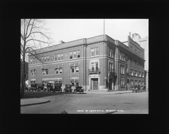 View of the Detroit Board of Commerce building on the corner of Lafayette and Wayne, with autos parked on street in front and on side. Recorded in lantern slide ledger: "D/Buildings-Board of Commerce."