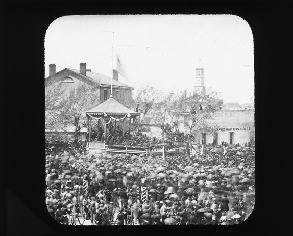 Huge crowd of people gathers at Campus Martius for a reception for General O.B. Willcox in 1862, the old State Capitol can be seen in background. Recorded in lantern slide ledger: "D/History-Civil War-site of City Hall, Old State Capital in distance, return of Gen. Wilcox."