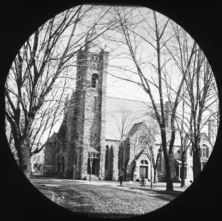 View of Church of Our Father Universalist church on the northwest corner of Macomb and Bagley, with trees in front of building. The church began holding services in 1881. Lantern slide mount has a round opening. Recorded in lantern slide ledger: "D/Churches-Universalist-Church of Our Father, Park and Bagley."