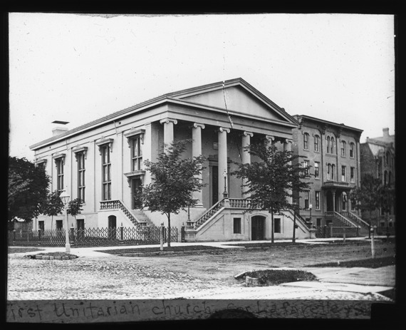 View of First Unitarian Church on the northwest corner of Lafayette Avenue and Shelby Street. The church was dedicated in 1853. Handwritten on lantern slide, "First Unitarian Church, cor. Lafayette & Shelby." Slide is cracked in upper middle. Recorded in lantern slide ledger: "D/Churches-Unitarian-First, corner Lafayette and Shelby, erected in 1849."