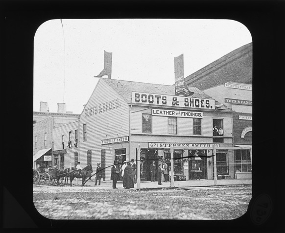 People stand near Stephen Smith Boots & Shoes on the northwest corner of Woodward and Larned, with two large boot shaped signs on roof of building. Lantern slide is cracked. Recorded in lantern slide ledger: "D/Streets-Woodward, N.W. corner of Larned, Stephen Smith Boots and Shoes."