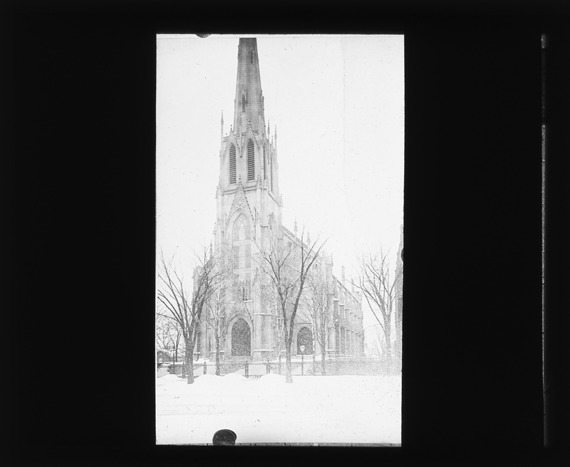 View of the Jefferson Avenue Presbyterian Church in winter; church was erected in 1853. Recorded in lantern slide ledger: "D/Churches-Presb.-Jefferson, erected 1853."