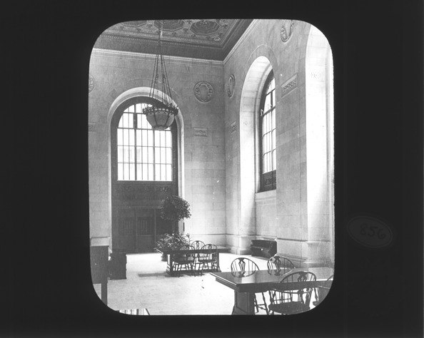 View of a reading room on the third floor of the Detroit Public Library, what is now Adam Strohm Hall, with large, high windows, benches and tables and chairs. Written in lantern slide ledger, "Delivery Hall, corner." Recorded in lantern slide ledger: "D/Public Library-Delivery Hall, corner."
