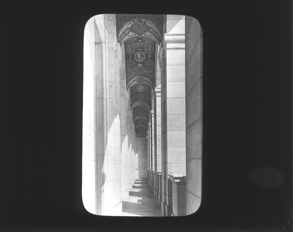 View of loggia outside the windows of the Fine Arts Room at the Detroit Public Library. The loggia, designed by Frederick J. Wiley and executed by Mary Chase Stratton and Horace Caulkins of Pewabic Pottery, is made of "gres flambe" which means that the tesserae are of enameled baked clay and not of glass. The scene entitled, "Seven Ages of Man", represents a scene from Shakespeare's, "As you like it," within each arch a panel depicts each age, infant, schoolboy, lover, soldier, justice, old man and second childhood. The floor is marble and embedded with signs of the zodiac and swastikas. Recorded in lantern slide ledger: "D/Public Library-Loggia, c.2."