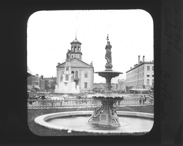 Front view of the old Detroit City Hall with the Soldiers' and Sailors' Monument directly in front of it and a fountain in the middle foreground. Lantern slide ledger reads: "Fountain later Grand Circus Park." Recorded in lantern slide ledger: "D/Buildings-City Hall, old."
