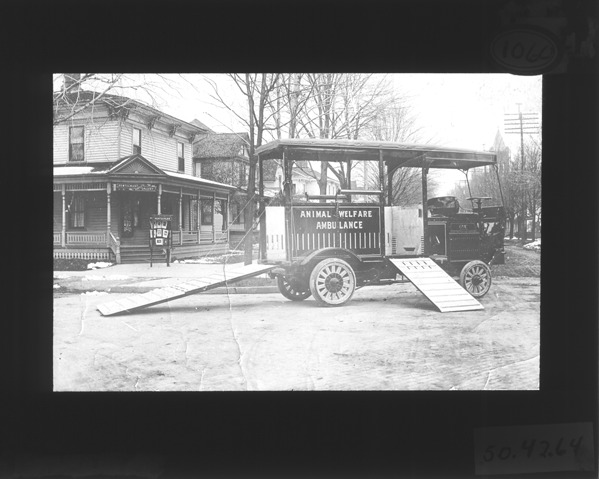 Side view of an animal welfare ambulance with ramps leading up to the back and side of vehicle, printed on side of truck, "GMC," in left background is the Rentschler Photographic Gallery. Recorded in lantern slide ledger: "D/Ambulances-Animal Welfare-ambulance."