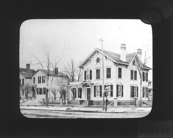 View of an unidentified house. The image shows a three-story wood frame house in the Gothic revival style.