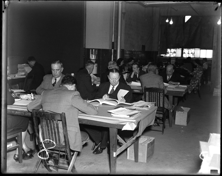Favorite this☆ Works Progress Administration office interior Description: Interior view of a Works Progress Administration office, with men and women sitting at tables. Recorded in glass negative ledger: "D/Works Progress Administration." Details Resource ID: EB02c936 Subject: United States. Works Progress Administration Public service employment--Michigan--Detroit Glass negatives Date Issued: Unknown year Format: 1 negative : glass ; 5 x 4 in. Member of: Burton Historical Collection Negative Number: BHC glass neg. no. 8 Rights: Physical rights are retained by DPL. Copyright is retained in accordance with U.S. copyright laws.