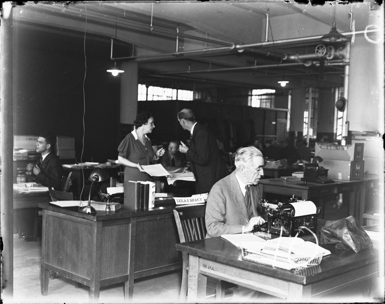 Favorite this☆ Works Progress Administration office interior Description: Man and a woman (Leila E. Bracy) talk at a desk while others around them work at desks in a Works Progress Administration office. Recorded in glass negative ledger: "D/Works Progress Administration." Details Resource ID: EB02c938 Subject: United States. Works Progress Administration Public service employment--Michigan--Detroit Glass negatives Date Issued: Unknown year Format: 1 negative : glass ; 4 x 5 in. Member of: Burton Historical Collection Negative Number: BHC glass neg. no. 10 Rights: Physical rights are retained by DPL. Copyright is retained in accordance with U.S. copyright laws.