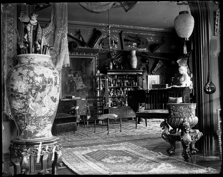 View of a living room inside the residence of Frederick Sterns, with oriental rugs covering the floor and chairs, a curio cabinet and a love seat in background, with vases in the foreground. Recorded in glass negative ledger: "D/Historic houses-Stearns, Frederick."