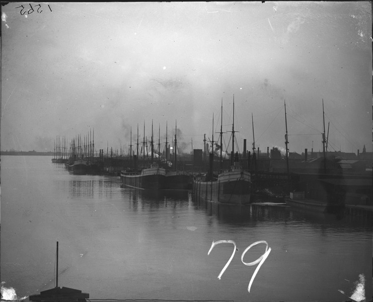 Line of boats, mainly freighters, docked at the Detroit River, with buildings in background. Recorded in glass negative ledger: "D/River."