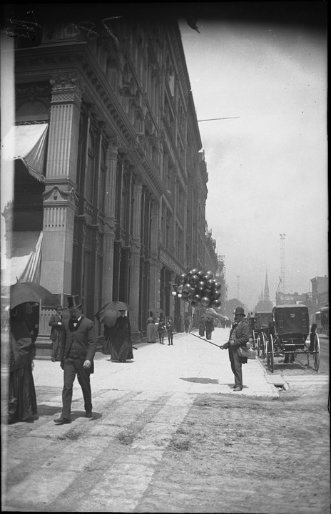 Helium balloon peddler stands on unidentified sidewalk in front of building, with people walking by. Recorded in glass negative ledger: "D/Peddlers & peddling; also LD/Streets-Woodward."