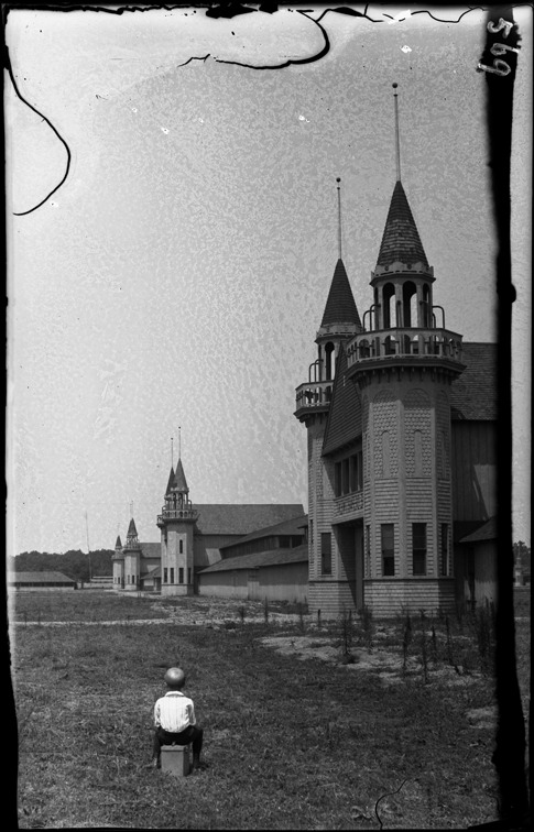 Boy sits on a box in foreground, in background is the main building for the Detroit International Fair and Exposition, at the time, it was the largest exhibition building in the world. Recorded in glass negative ledger: "D/Exhibitions-Detroit international fair & exposition."