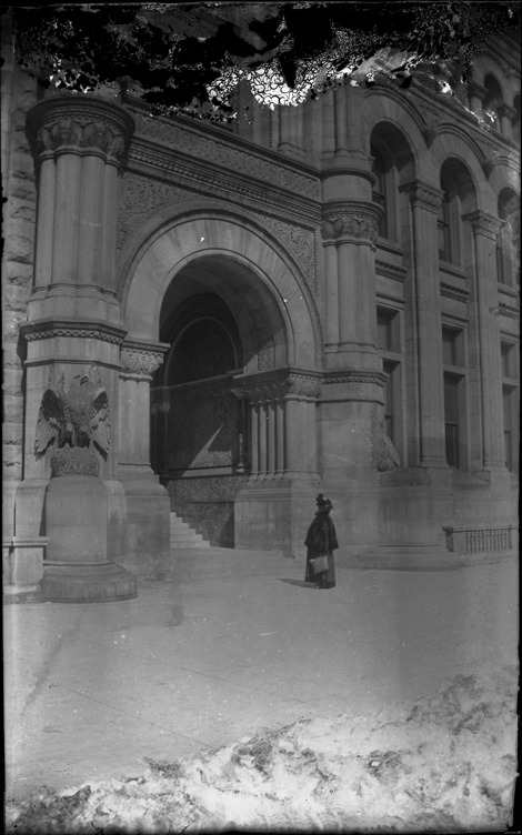 Woman stands in front of the U.S. Post Office in Detroit, Michigan, to her left is a statue of an eagle, snow is piled in foreground. Recorded in glass negative ledger: "LD/Buildings-Federal-Post office, 1897." Emulsion is damaged at top of glass negative.