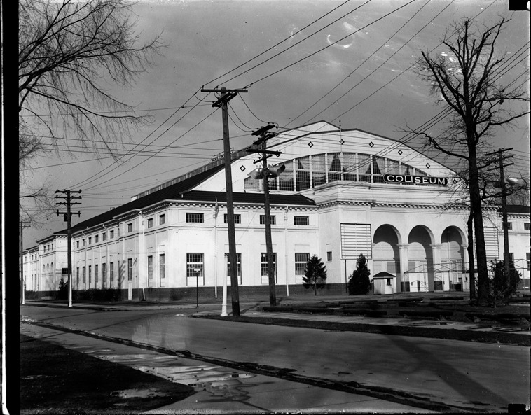 View of the front and one side of the Michigan State Fair Riding Coliseum, Dairy Cattle Building and Agricultural Building at the Michigan State Fairgrounds in Detroit, Michigan. The building was designed by Lynn W. Fry in the classical revival style and constructed in two intervals between 1922 and 1926. Recorded in glass negative ledger: "D/Buildings-Coliseum."