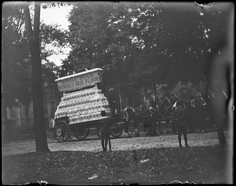 Decorated wagon with a sign reading, "Royal Star, Herkel's Best Flour," and filled with bags of flour, appears to wait to enter Labor Day parade, two boys watch in foreground. Recorded in glass negative ledger: "LD/Anniversaries-Labor day."