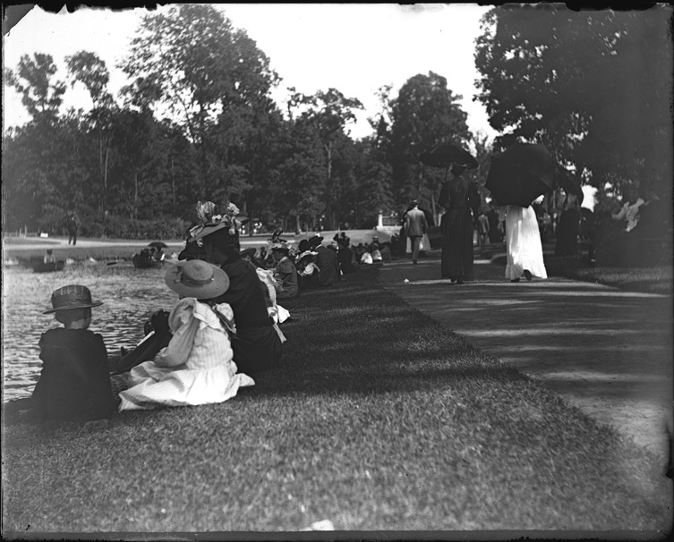 People sit along the banks of a canal in Belle Isle Park, Detroit, Michigan, as others stroll on path. Recorded in glass negative ledger: "D/Parks-Belle Isle."