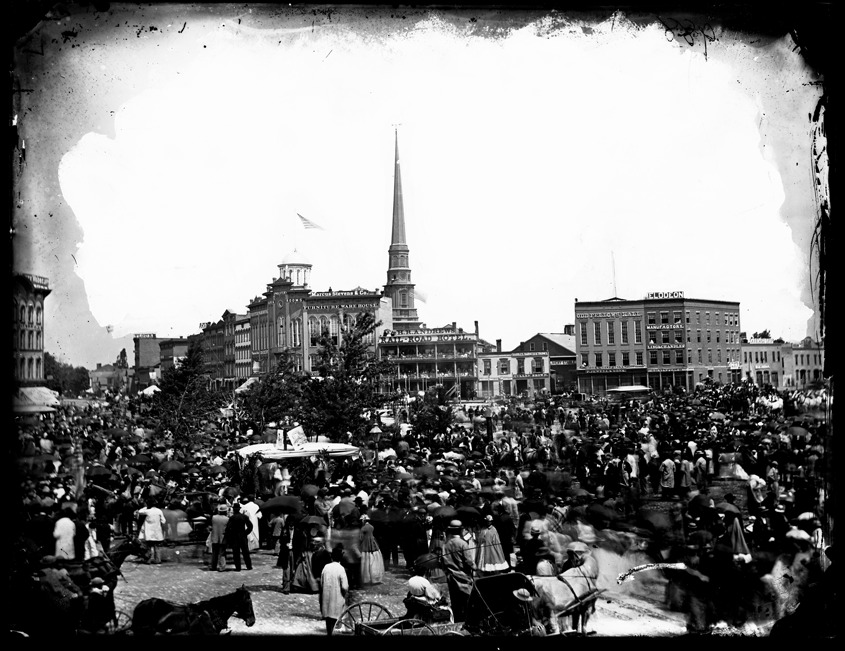 Large crowd of people gathers at Campus Martius for presentation of colors to the 1st Michigan Infantry on their departure, May 11, 1861, the soldiers have either not yet arrived or have departed, with H.R. Andrew's Rail-Road Hotel in the center background (site of the later Detroit Opera House). Recorded in glass negative ledger: "D/History-Civil War."