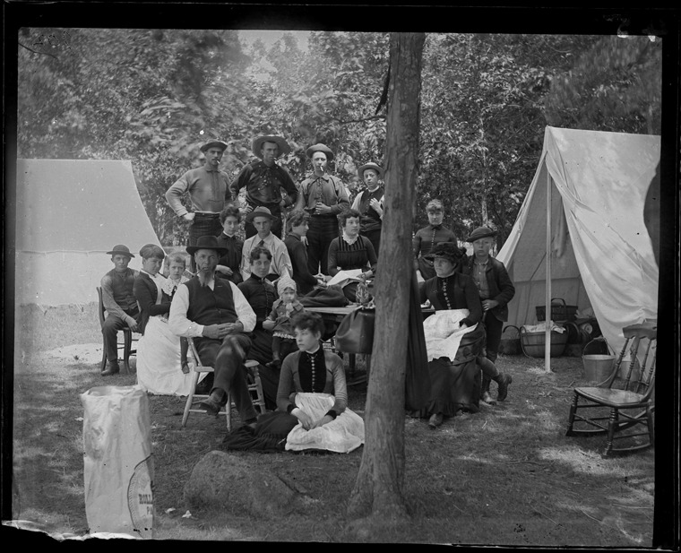 Group portrait of campers on Snake Island, with tents on either side and trees in background. Recorded in glass negative ledger: "D/River-Islands-Snake."