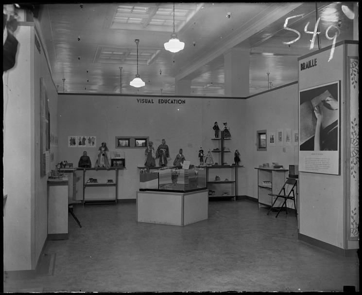 Visual education display for the Skills of the Unemployed exhibition at the Works Progress Administration, which contains doll with the features of costumes of various ethnic groups, with accompanying printed material on the walls. Recorded in glass negative ledger: "D/Works Progress Administration (WPA)."